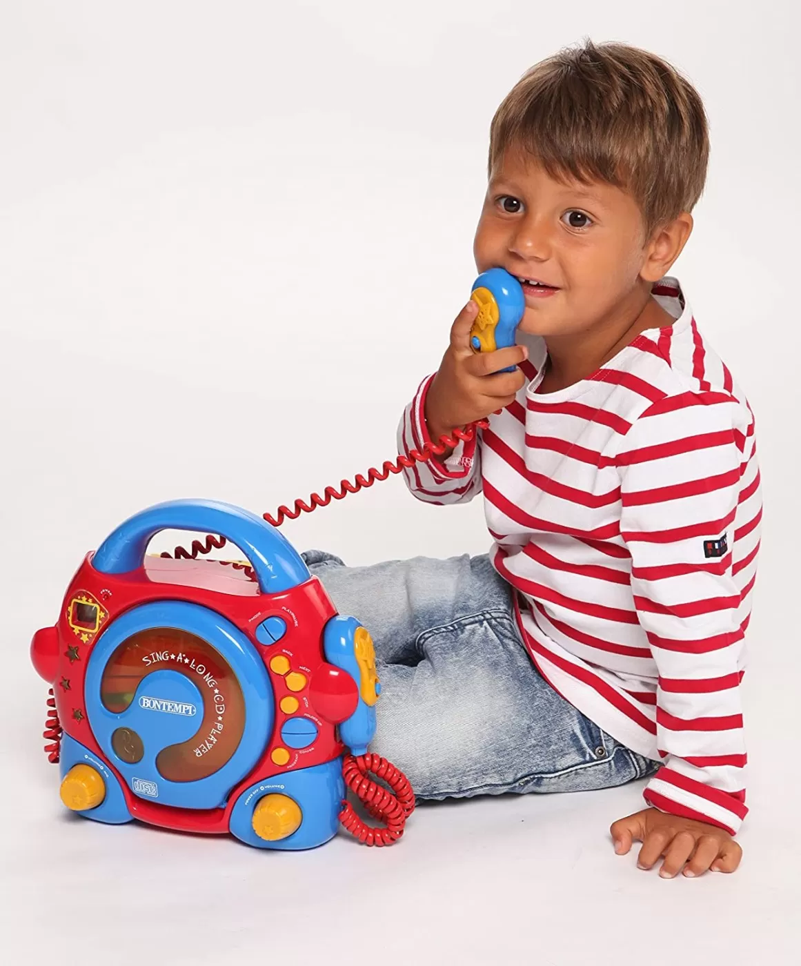 Cd player-ul portabil cu 2 microfoane este device-ul ideal pentru animarea petrecerilor copiilor. Caracteristici efecte luminoase, display luminos cu indicator digital, buton on/off pentru volum, control volum pentru microfoane, posibilitate de selectare sau de repetare a melodiei, adaptor inclus.Beneficii familiarizarea cu muzica si ritmul, dezvoltarea abilitatilor sociale si cognitive, coordonarea miscarilor, atentia distributiva.Produsul necesita 4 baterii de 1.5V R14/C (nu sunt incluse).