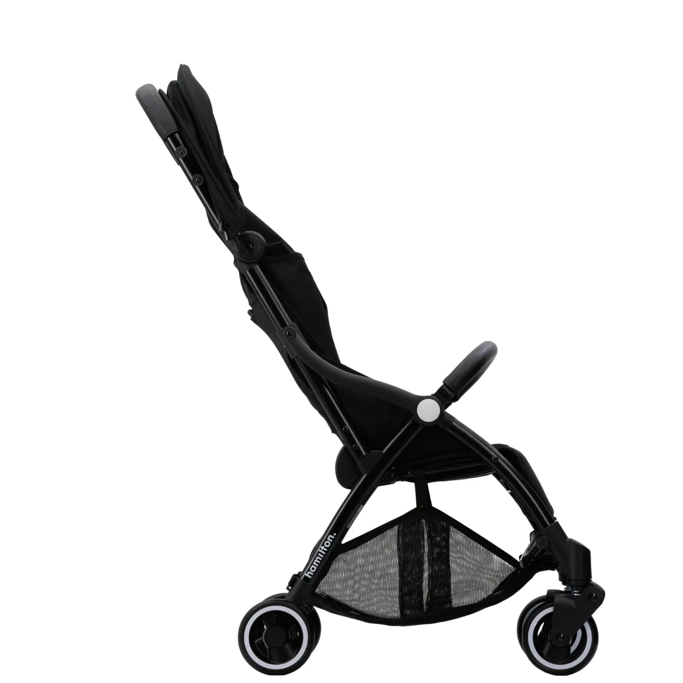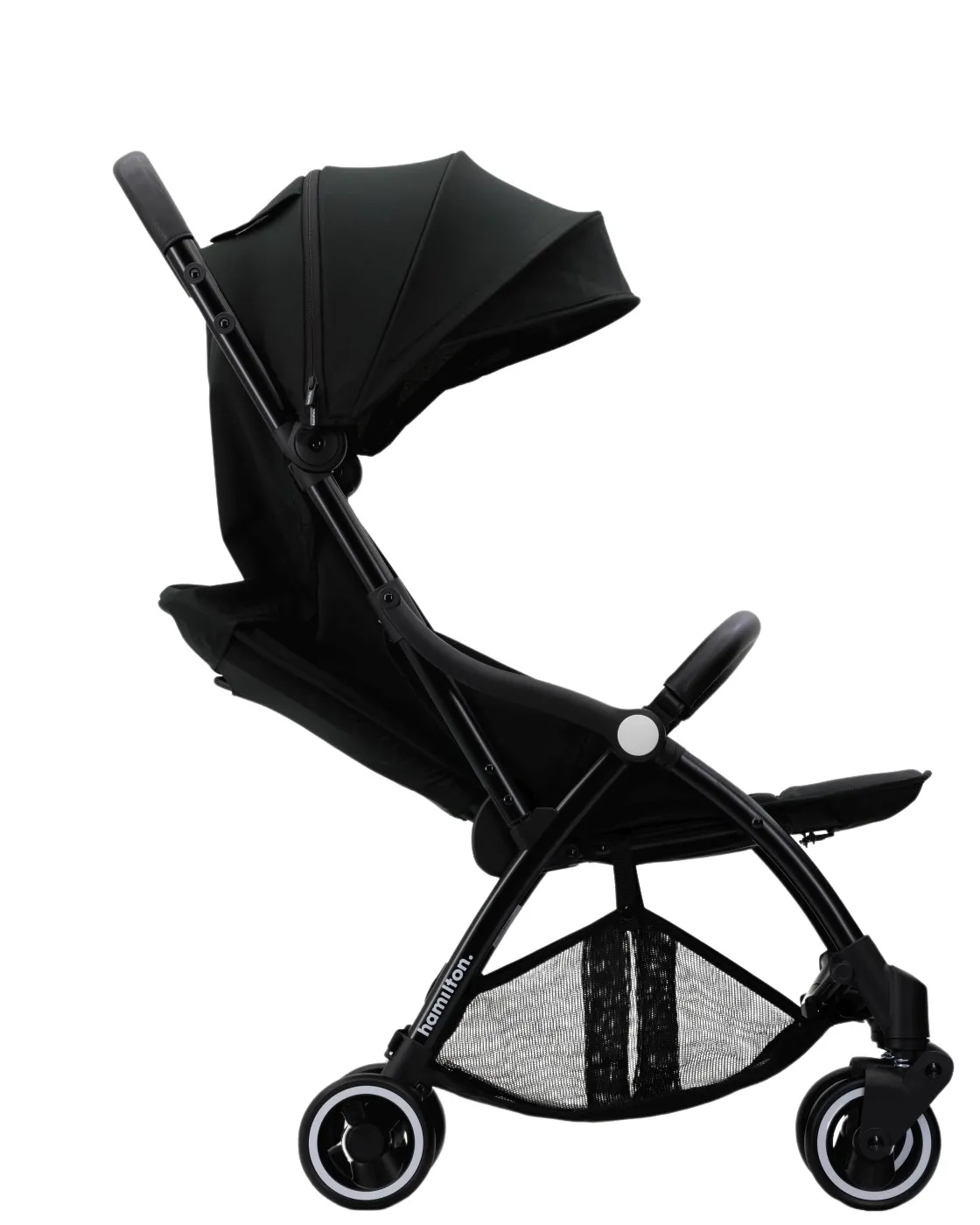 Carucior sport cu pliere compacta automata, Hamilton X1 PLUS, BLACK Caruciorul care creste odata cu copilul tau Caruciorul Hamilton X1 PLUS BLACK de la Yoop are o rama de aluminiu anodizat de inalta calitate si material premium. Datorita sezutului spatios si confortabil, caruciorul reprezinta un loc sigur pentru bebelusul tau, de la nastere pana la 4 ani sau pana la 22 kg. Hamilton X1 PLUS BLACK este unul dintre cele mai usoare modele de carucioare de pe piata, cu o greutate de doar 7,5 kg. Cu functia de pliere compacta si automata devine un partener ideal atat in timpul plimbarilor cat si in calatorii. Indiferent daca te indrepti spre un restaurant sau ai planificat o calatorie mai lunga, Hamilton X1 PLUS BLACK face fata oricarei situatii fara probleme! Ce face ca acest carucior sa fie o alegere atat de avantajoasa? Sistemul de pliere automata – Pliere si deschidere cu un singur click Carucioarele Hamilton de la Yoop se numara printre cele mai populare carucioare de pe piata. Nu doar datorita calitatii lor premium la preturi accesibile, ci si gratie mecanismului unic MagicFold patentat de noi. Pliaza si deschide in cateva secunde cu o simpla apasare de buton. Conceput pentru a oferi confort În timpul plimbarii, bebelusul tau sta in sezut sau intins complet relaxat in carucior. Un scaun spatios, cu spatar reglabil in 3 pozitii, plasa de ventilatie si o copertina extensibila cu protectie anti-UV 50+ pentru a proteja impotriva ultravioletelor. Reglarea pozitiilor sezutului acum este mult mai simpla. Accesand clapeta cu o singura mana, puteti regla mult mai simplu pozitia spatarului chiar si atunci cand aveti cealalta mana ocupata. Caruciorul este dotat cu mesh system cu tehnologie climat cool care asigura respirabilitate si confort chiar si pe parcurusul calatoriilor lungi in perioadele fierbinti ale verii. Avand suspesii pe toate cele 4 roti, caruciorul Hamilton X1 PLUS BLACK de la Yoop poate face fata oricarui drum. Conceput pentru siguranta Hamilton X1 PLUS BLACK este combinatia perfecta intre siguranta, rezistenta si simplitate. Siguranta copilului tau este garantata prin sistemul de centuri magnetice cu prindere in 5 puncte si sistemul de franare unica cu pedala mare. Parintii pot deschide si inchide cu usurinta catarama magnetica. Totusi, catarama este complet sigura pentru copii. Carucioarele Hamilton de la Yoop respecta standardele de siguranta EN 1888. În plus au omologare Oeko-Tex Standard 100 plus pentru materialele textile care sunt testate pentru substante nocive si ecologice Oeko-Tex Standard 100 plus combina cerintele Oeko-Tex Standard 100 (respectarea limitelor substantelor nocive) Oeko-Tex Standard 1000 (productte ecologica, eliminare a apelor uzate, consumul de energie) Unul dintre cele mai compacte carucioare – Potrivit ca bagaj de mana Caruciorul poate fi pliat compact si poate ramane in pozitie verticala fara a necesita sprijin. Datorita unei curele atasate este usor de transportat pe umar. Astfel, nu exista nicio problema in a-l lua cu tine in tren sau in masina! Caruciorul se potriveste in majoritatea compartimentelor pentru bagaje din avioane. Calatorii usoare cu Sistemul de Calatorie – Combinatie perfecta Cand iesiti din masina, fixati scoica auto Zeno pe caruciorul Hamilton X1 PLUS BLACK folosind adaptorul pentru scoica Hamilton by Yoop. Datorita functiei inteligente 'Easy Click', puteti atasa sau detasa scoica auto cu o singura mana! Specificatii tehnice Lungime 790 mm Lungime dupa pliere 260 mm Latime 480 mm Latime dupa pliere 480 mm Înaltime 1020 mm Înaltime dupa pliere 570 mm Greutate 7.5 kg Ce include pachetul Caruciorul Hamilton X1 Plus, Suport pentru pahar, Geanta de protectie/transport.