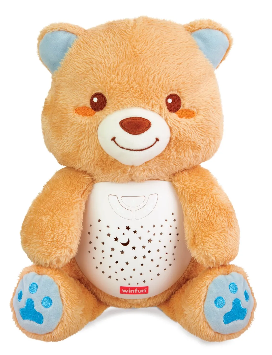 Proiectorul si lampa de veghe 2-in-1 in forma de ursulet este o jucarie multifunctionala si educativa, perfecta pentru a linisti si a acompania copiii de la nastere. Aceasta jucarie inovatoare ofera o combinatie de lumina linistitoare si sunete placute, creand un mediu confortabil si sigur pentru somnul celor mici. Proiectorul are capacitatea de a proiecta un cer instelat pe tavan sau pereti, transformand camera copilului intr-un univers magic si relaxant. Lampa de veghe emite o lumina blanda in diferite culori, care poate fi ajustata pentru a se potrivi preferintelor copilului. Ursuletul este si un prieten de noapte imbratisabil! Designul sau moale si placut la atingere permite copiilor sa il tina in brate, oferindu-le un sentiment suplimentar de confort si securitate. Ursuletul luminos devine astfel un companion ideal pentru copiii mici, care se pot bucura de prezenta lui atat in timpul somnului, cat si in timpul jocului. Proiectorul si lampa de veghe 2-in-1 in forma de ursulet este echipat cu un buton de muzica care ofera doua optiuni de sunet sunete din natura sau melodii de leagan linistitoare. Sunetele din natura, precum ciripitul pasarilor sau sunetul apei curgatoare, contribuie la crearea unui mediu relaxant si natural, ideal pentru a calma si a adormi copilul. Melodiile de leagan linistitoare sunt perfecte pentru a induce somnul, oferind o atmosfera calma si placuta.